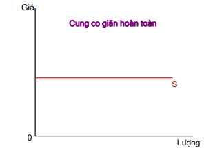 Đường cung co giãn hoàn toàn có dạng đường cung nằm ngang (như minh họa ở biểu đồ dưới đây). Đường cung của nhà cung cấp mà ở đó thị trường có vô số người mua và bán sẽ có đường cung gần như co giãn hoàn toàn. Khi đó, mỗi nhà cung cấp là người “nhận giá”, nhà cung cấp không thể tác động vào mức giá của thị trường.