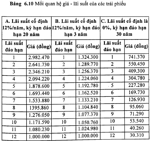 Ví dụ 6.20: Đường biểu diễn mối quan hệ giá – lãi suất đối với trái phiếu ngắn hạn có lãi suất cao hầu như sẽ là 1 đường thẳng, vì giá không thay đổi nhiều bằng sự thay đổi lãi suất (ví dụ trái phiếu kỳ hạn 3 năm, lãi suất 12%/năm trong bảng 6.10). Ngược lại, đường biểu diễn mối quan hệ cho trái phiếu dài hạn lãi suất thấp sẽ là 1 đường cong, như trường hợp trái phiếu 30 năm lãi suất cố định bằng 0 trong bảng 6.10. Sự khác nhau về độ cong này đã được biểu hiện rõ trong bàng 6.10. Độ cong của đường quan hệ lãi suất – giả được xem như là độ lồi của trái phiếu.