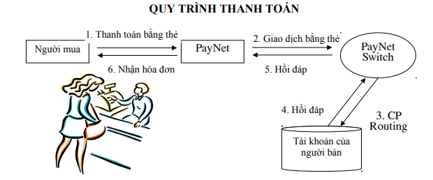 Bước 2: Thiết bị POS kết nối về hệ thống PayNet, gửi yêu cầu xử lý giao dịch thanh toán điện tử Bước 3: Hệ thống PayNet kiểm tra thông tin bảo mật và cấp phép và chuyển giao dịch sang ngân hàng tương ứng để thực hiện. Bước 4: Ngân hàng kiểm tra thông tin giao dịch và chuyển khoản từ tài khoản khách hàng sang tài khoản đại lý. Sau đó, kết quả giao dịch được gửi lại PayNet. Bước 5: PayNet ghi nhận kết quả giao dịch và gửi thông tin giao dịch tới thiêt bị POS. Bước 6: Thiêt bị POS in biên lai. Đại lý sẽ chuyển giao biên lai cho khách hàng để chứng nhận giao dịch thanh toán. |