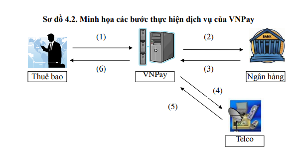 Tin nhắn được chuyển sang ngân hàng (nơi khách hàng mở tài khoản) NH thực hiện thanh toán, chuyển tiền từ tài khoản của khách hàng vào tài khoản của VNPay và thông báo lại cho VNPay VNPay gửi lệnh nạp tiền vào tài khoản cho khách hàng sang Telco Telco nạp tiền cho khách hàng và thông báo cho VNPay (đồng thời thông báo cho khách hàng) VNPay thông báo cho khách hàng bằng SMS |