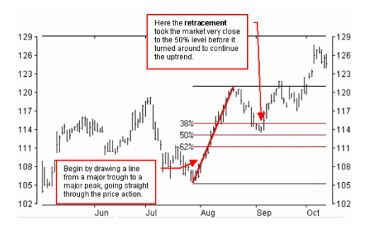 - Đường thẳng nằm ngang được vẽ theo ba mức Fibonacci là 38%, 50% và 62% (xem biểu đồ dưới đây).