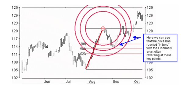 Fibonacci vòng cung có thể được đưa vào cùng biểu đồ hoặc có thể được vẽ đơn lẻ. Đường vòng cung được vẽ xung quanh điểm đáy hoặc điểm đỉnh gần đây nhất. Đường vong cung Fibonacci cắt đường xu hướng giá gốc (trendlines) tại các điểm giao cắt của đường Truy hồi Fibonacci Retracements. Giá sẽ có xu hướng “phản ứng” khi tiếp xúc các đường vòng cung và đường Truy hồi retracements. Quy vị có thể xem các điểm tiếp xúc này như là mức hỗ trợ và mức kháng cự.