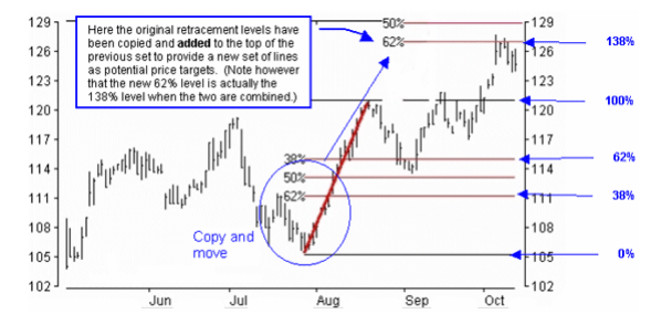 Quý vị cũng có thể tiến hành nghiên cứu chuyên sâu dựa trên các con số Fibonacci để xây dựng các mức giá mục tiêu (price targets). Một trong các phương pháp là copy đường Fibonacci cũ vào phía trên hoặc phía dưới đường Fibonacci đầu tiên (phụ thuộc vào xu hướng thị trường thế nào). Phương pháp này sẽ cho quý vị các mức giá mục tiêu dựa trên một bộ mới đường 38%, 50% và 68%.