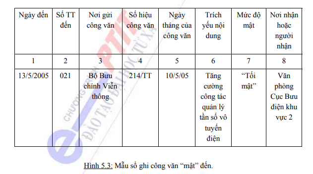 Sổ ghi công văn “mật” cũng tưong tự như sổ ghi công văn thường nhưng có thêm cột “mức độ mật”. Ở cột này cần phải ghi rõ công văn là “mật” “tối mật” hay “tuyệt mật”.