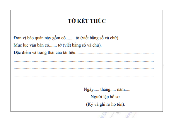 -Viết tờ kết thúc. Mỗi hồ sơ phải có chứng từ kết thúc. Tờ chứng từ kết thúc được in theo mẫu có sẵn, bao gồm các nội dung sau: