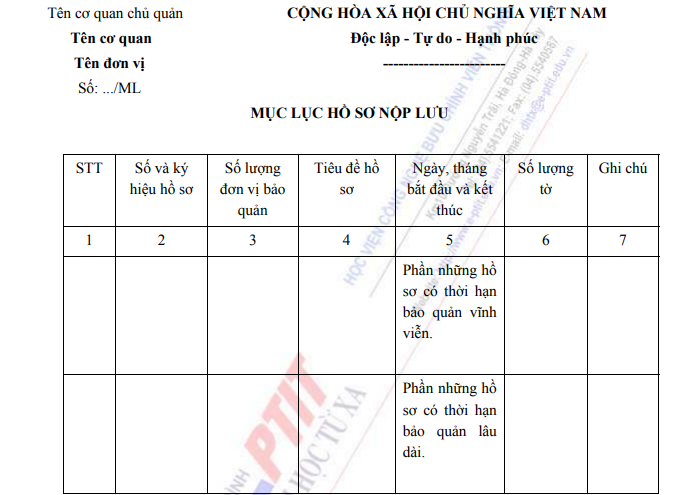 Hình 5.8: Mầu mục lục hồ sơ nộp lưu.