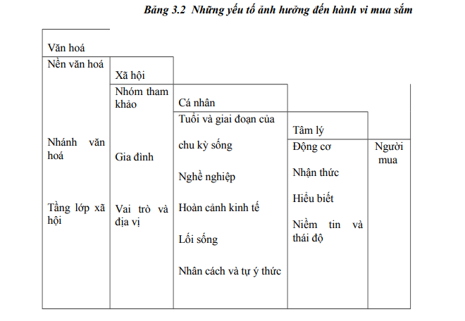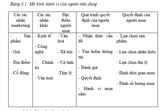 Thực tế chỉ ra rằng có rất nhiều yếu tố ảnh hưởng quyết định của con người liên quan đến việc mua hàng. Hành vi của người mua hàng không bao giờ đơn giản; tuy nhiên việc am hiểu hành vi của người mua hàng lại là một nhiệm vụ vô cùng quan trọng đối với những người làm marketing. Nhiệm vụ của người làm Marketing là hiểu được điều gì xảy ra trong ý thức của người mua giữa lúc các tác nhân bên ngoài bắt đầu tác động và lúc quyết định mua. Ta sẽ tập trung vào những đặc điểm của người mua: văn hoá, xã hội, cá nhân và tâm lý ảnh hưởng đến hành vi mua sắm . Hành vi mua sắm của người tiêu dùng được mô tả qua bảng 3.1: