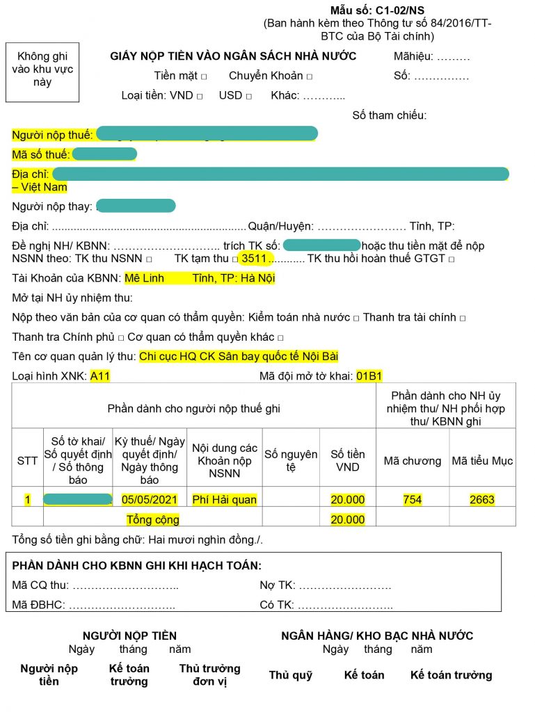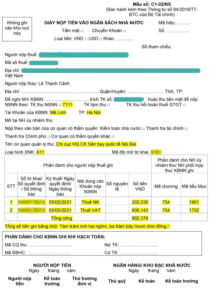 Người nộp thay: Ghi tên Công ty bạn – Mã số thuế: Ghi mã số thuế Cty Bạn.