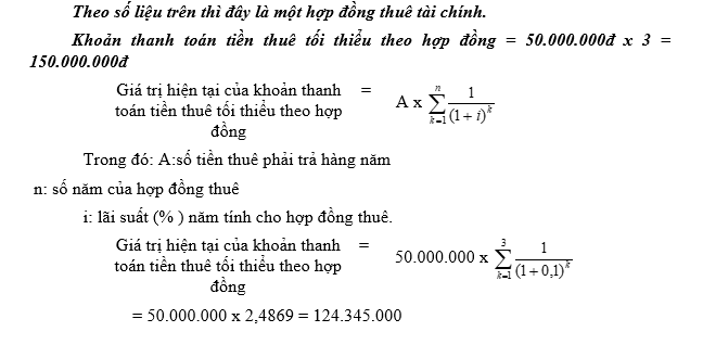 Như vậy giá trị hiện tại của khoản thanh toán tiền thuê tối thiểu theo hợp đồng nhỏ hơn giá trị hợp lý của tài sản thuê (124.345.000 < 135.000.000), nên nguyên giá TSCĐ thuê tài chính được xác định theo giá trị hiện tại của khoản thanh toán tiền thuê tối thiểu.