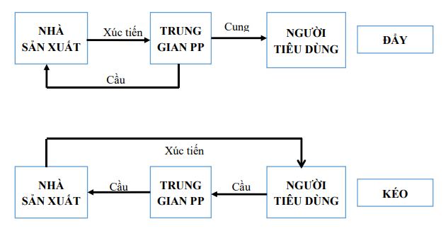 - Chiến lược đẩy hay kéo: Hệ thống xúc tiến hỗn hợp chịu ảnh hưởng chủ yếu từ vấn đề doanh nghiệp chọn chiến lược đẩy hay kéo để tạo ra mức tiêu thụ. Hai chiến lược này trái ngược nhau và được thể hiện trong sơ đồ 9.2. Chiến lược đẩy đòi hỏi hoạt động marketing của nhà sản xuất (chủ yếu là lực lượng bán hàng và khuyến mại bán buôn) phải hướng vào những người trung gian của kênh để kích thích họ đạt hàng cùng kinh doanh sản phẩm đó và quảng cáo cho người sử dụng cuối cùng. Chiến lược kéo đòi hỏi hoạt động marketing (chủ yếu là quảng cáo và khuyến mại với người tiêu dùng) hướng vào người sử dụng cuối cùng để kích thích họ yêu cầu những người trung gian đặt hàng của nhà sản xuất.