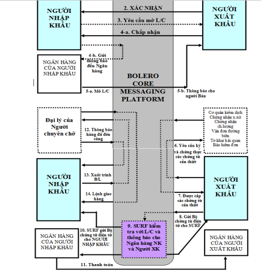 Bước 8: Người xuất khẩu gửi bộ chứng từ điện tử cho Trung tâm xử lý thanh toán (SURF – Settlement Utility for managing Risk and Finance) thuộc Bolero.net để tổ chức kiểm tra và tiến hành thanh toán;