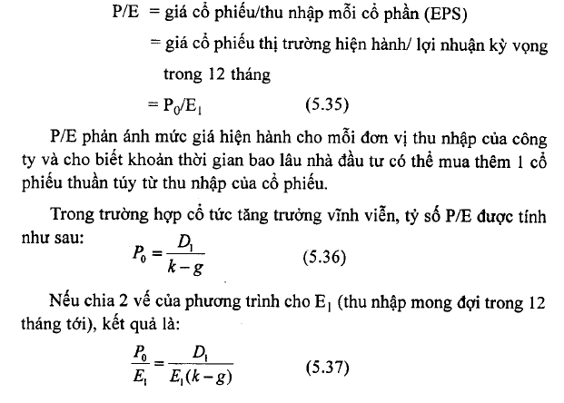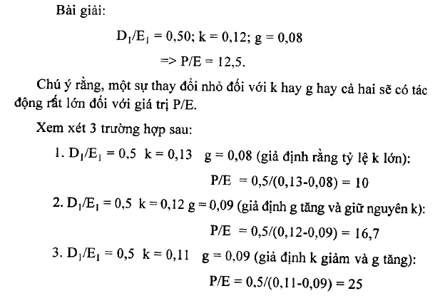 Ví dụ 5.8: Công ty PVI có các thông tin như sau: tỷ lệ chia cổ tức dự kiến là 50%, tỷ suất sinh lời kỳ vọng khi đầu tư vào cổ phiếu PVI này là 12%/năm và tỷ lệ tăng trưởng cổ tức dự kiến của cổ phiếu PVI là 8%/năm. Hãy tính toán chỉ số P/E của cổ phiếu PVI?