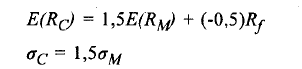 Giả sử nhà đầu tư vay theo lãi suất phi rủi ro với số tiền bằng 50% so với số vốn bỏ ra ban đầu. Bây giờ tỷ trọng đầu tư vào danh mục M sẽ là 150% (y = 1,5) và tỷ trọng đầu tư vào tài sản phi rủi ro sẽ là -50%.(13) Tỷ suất lợi tức kỳ vọng và độ lệch chuẩn của danh mục đầu tư kết hợp giữa danh mục M và sử dụng đòn bẩy là: