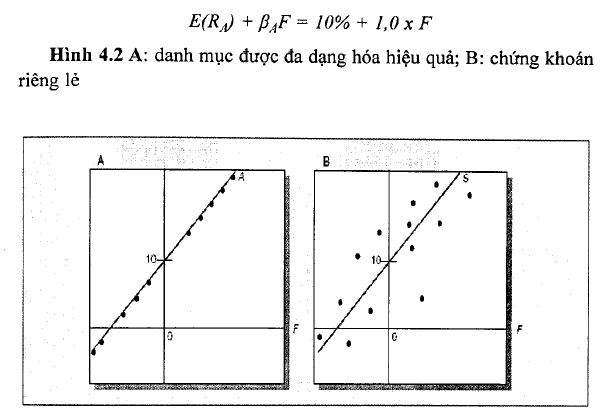 So sánh Hình 4.2A với 4.2B, danh mục A và chứng khoán B đều có ß = 1 của một cổ phiếu đơn nhất. Chứng khoán không đa dạng hóa sẽ đối mặt với rủi ro phi hệ thống. Đây là những điểm phân tán xung quanh đường in đậm. Ngược lại, lợi tức của danh mục đầu tư được đa dạng hóa hiệu quả được quyết định bởi các nhân tố hệ thống.