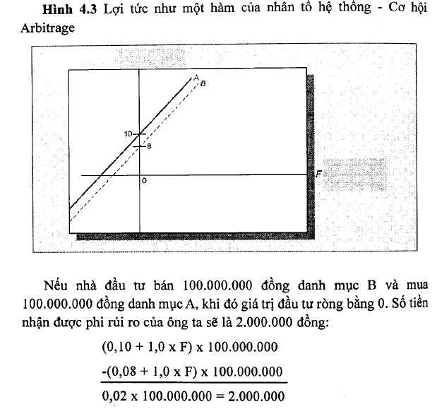 Phương trình cùa Lý thuyết APT, phương hình (4.4), thể hiện mối quan hệ giữa rủi ro và TSLT kỳ vọng mà không có các cơ hội chênh lệch, vế trái của phương trình là TSLT kỳ vọng của một sự đàu tư. vế phải là TSLT kỳ vọng của một DMĐT mô phỏng với cùng các ß nhân tố của sự đầu tư. Phương trình (4.4) chỉ ra rằng nếu 02 tài sản hay 02 danh mục đầu tư có hệ số beta bằng nhau, tỷ suất lợi tức kỳ vọng của 02 tài sản hay danh mục đầu tư này sẽ bằng nhau. Nếu không, nhà đầu tư sẽ tiến hành kinh doanh chênh lệch giá và điều này sẽ làm cân bằng tỷ suất lợi tức của 02 tài sản này.