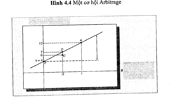 Vậy điều gì sẽ xảy ra nếu hệ số beta khác nhau? Chúng ta sẽ chỉ ra rằng phần bù rủi ro của chúng phải tương xứng với hệ số beta. Xem xét Hình 4.4. Giả định rằng lợi tức phi rủi ro là 4% và rằng danh mục c được đa dạng hóa hiệu quả với hệ số ß là 0,5 và lợi tức kỳ vọng là 6%. Xem xét thêm một danh mục mới, D, gồm một nửa là danh mục A và một nửa là tài sản phi rủi ro. Hệ số ß của danh mục D sẽ là (1/2 X 0 + 1/2 X 1,0)= 0,5 và lợi tức kỳ vọng là (1/2 X 4 + 1/2 X 10 ) = 7%. Danh mục D lúc này có hệ số ß bằng danh mục c, nhưng cỏ lợi tức kỳ vọng lớn hơn danh mục c. Điều này tạo ra cơ hội Arbitrage.