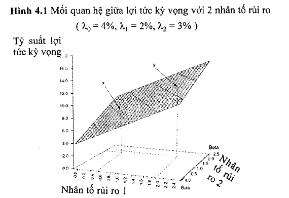 Bảng 4.4 trên đây tổng hợp những đặc tính có liên quan của hai mô hình này. Từ bảng tóm tắt này, ta nhận thấy một cách rõ ràng sự khác nhau cơ bản giữa hai lý thuyết trên nằm trong cách xác đinh rủi ro hệ thống, cụ thể một vài nhân tố rủi ro phản ánh rõ hơn những đặc điểm thị trường so với chỉ một nhân tố rủi ro đơn như sử dụng trong mô hình CAPM. Điều quan trọng phải nhận thấy là cả hai lý thuyết trên đều dựa vào những mô hình tuyến tính trên cơ sở tin tưởng rằng những nhà đầu tư sẽ được bù đắp từ việc thực hiện hai chức năng: điều chuyển vốn và chấp nhận rủi ro. Cuối cùng, lưu ý rằng phương trình APT đưa ra giả thiết về một mối liên hệ tương tự như đường thị trường chứng khoán của CAPM. Tuy nhiên, thay vì kết hợp giữa rủi ro và lợi tức kỳ vọng, APT sử dụng một mặt phăng không gian thị trường chứng khoán với kích thước (K+l) chiều, trong đó K là chiều biểu diễn cho K nhân tố rủi ro và 1 chiều thêm vào biểu diễn cho tỷ suất lợi tức kỳ vọng của chứng khoán. Hình 4.1 minh họa cho mối quan hệ của hai nhân tố rủi ro (K~2).