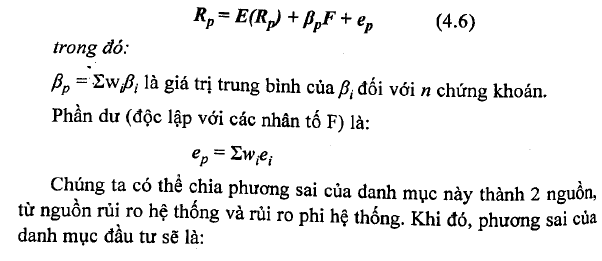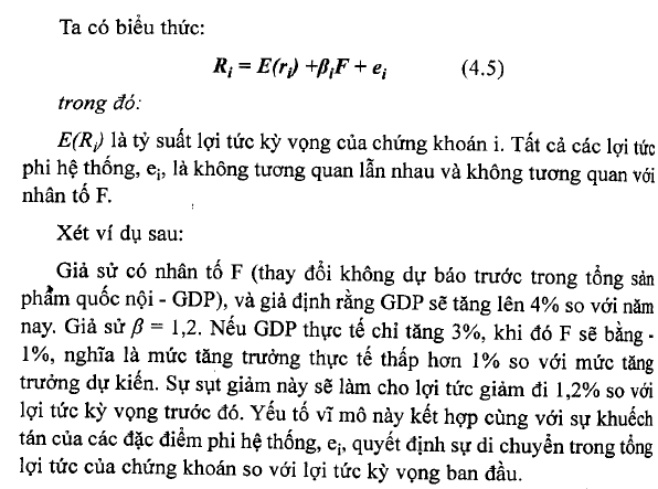 Nếu gọi F là độ lệch của các nhân tố chung so với giá trị kỳ vọng của nó, ßi là hệ số đo lường độ nhạy của công ty i đối với nhân tố chung, eị là đặc điểm riêng có của công ty, mô hình nhân tố xác nhận rằng lợi tức thực tế của công ty i bằng lợi tức kỳ vọng ban đầu cộng với phần lợi tức ngẫu nhiên được tạo ra do sự thay đổi của các nhân tố vĩ mô, và cộng với phần lợi tức ngẫu nhiên được tạo ra do sự thay đổi của cácyihân tố riêng cỏ của công ty.