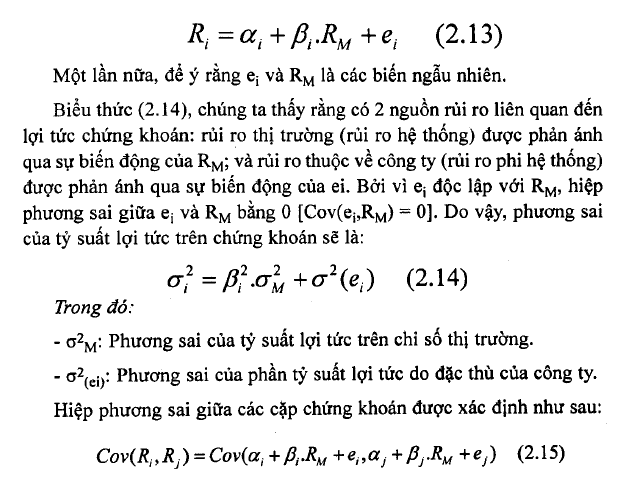 Biểu thức (2.11) cho thấy lợi tức trên chứng khoán được tách thành 2 phần: phần do ảnh hưởng chung của thị trường (PìRm – phần hệ thống), và phần độc lập Với thị trường (aj – phần do đặc thù của bản thân công ty niêm yét chứng khoán). Chúng ta có thể tiếp tục tách ai thành 2 phần như sau: