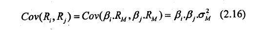 Bởi vì a¡ và Ọj là các hằng số, hiệp phương sai giữa chúng với bất kỳ biến ngẫu nhiên nào đó là bằng 0. Ngoài ra, chúng ta cũng đã giả thiết rằng phần tỷ suất lợi tức không kỳ vọng do đặc thù của công ty là độc lập với thị trường (e¡ độc lập với RM), và cũng độc lập với các chứng khoán khác (e¡ độc lập với Çj). Do vậy, mối tương quan duy nhất giữa hai chứng khoán bắt nguồn từ sự phụ thuộc chung của chúng vào chi số thị trường (RM). Nói cách khác, sự tương quan giữa hai chứng khoán là bởi vl lợi tức trên mỗi chứng khoán đều phụ thuộc một phần vào trạng thái chung của nền kinh tế. Do vậy, biểu thức (2.15) có thể viết lại: