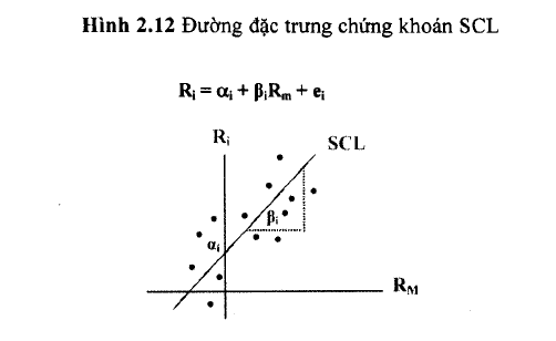 Ước lượng các hệ số <Xị, Pj, và ơ2e. trong các biểu thức ở trên có thể được thực hiện qua phân tích hồi quy theo dãy sổ thời gian.C5) Trong đỏ, biến độc lập là tỷ suất lợi tức trên chỉ số thị trường, và biến phụ thuộc là tỳ suất lợi tức trên chứng khoán i. Pi là hệ số góc của đường hồi quy, và <Xj là hệ số chặn của đường hồi quy. Trên đồ thị, đường hồi quy của mô hình chỉ số đơn được gọi đường đặc trưng chứng khoán (Securities Characteristic Line – SCL) (xem Hỉnh 2.12).