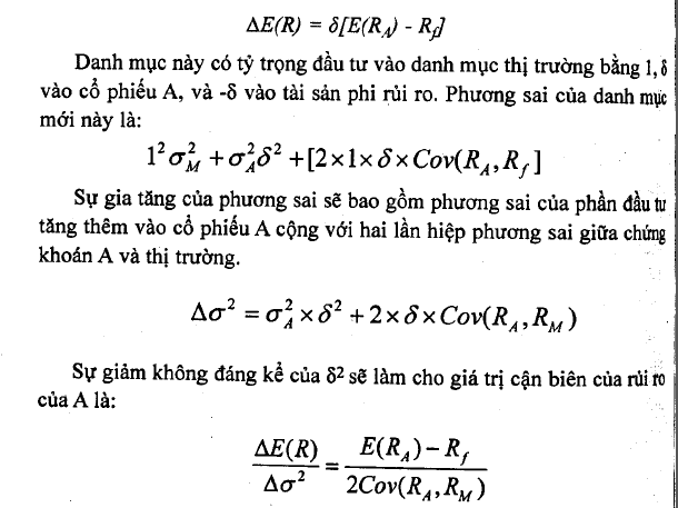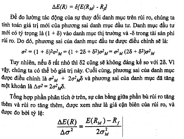 Dưới trạng thái cân bằng, giá trị biên của rủi ro cổ phiếu A phải bằng giả trị biên của rủi ro của danh mục thị trường. Ngược lại, nếu giá trị biên của rủi ro cổ phiếu A lớn hơn của thị trường, nhà đầu tư có thể tăng phân bù rủỉ ro danh mục của họ bằng cách tăng tỷ trọng của A trong danh mục đau tư. Khi giá của cổ phiếu A tăng so với giá của thị trường, nhà đau tư sẽ mua co phiếu A. Quá trình này sẽ tiếp tục duy trì cho đến khi giá co phieu được điêu chỉnh để giá trị biên của rủi TO cổ phiếu A bằng với của thị trường. Quá trình này sẽ diễn biến ngược lại nếu giá tri biên của rủi ro co phỉeu A nhỏ hơn giá trị biên của rủi ro danh mục ỆỊ trường. Do vậy, sự biến thiên trong giá trị biên của rủi ro của A sẽ dẫn đến mối quan hệ giữa phần bù rủi ro của cổ phiếu A và phần bù rủi rô của danh mục thị trường: