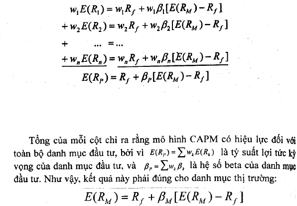 Nếu mối quan hệ giữa tỳ suất lợi tức kỳ vọng và hệ số beta được duy trì cho bất kỳ tài sản riêng lẻ thì nó phải duy trì cho bất kỳ sự kết hợp các tài sàn. Giả sử rằng một vài danh mục đầu tư p có tỷ trọng Wj{ đổi vởi cổ phiếu k (k lấy giá trị từ 1,…., n). Từ phương trình (3.12), chúng ta có n phương trình CAPM kết nối mỗi tài sản ừong danh mục đầu tư: