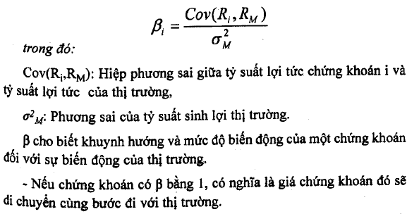 Để có thể xác định mức rủi ro của một chứng khoán cụ thể, ta cần đo lường độ nhạy cảm của chứng khoán đó với các biến động của thị trường. Độ nhạy cảm này gọi là Beta (ß). Beta của một chứng khoán là hệ số đo lường độ nhạy giữa tỷ suất sinh lợi trên chứng khoán đó đối với tỷ suất lợi tức trên chỉ số thị trường. Do đó, ß được dùng đo lường mức độ biến động hay còn gọi là thước đo rủi ro của một chứng khoán trong tương quan với danh mục thị trường theo công thức sau: