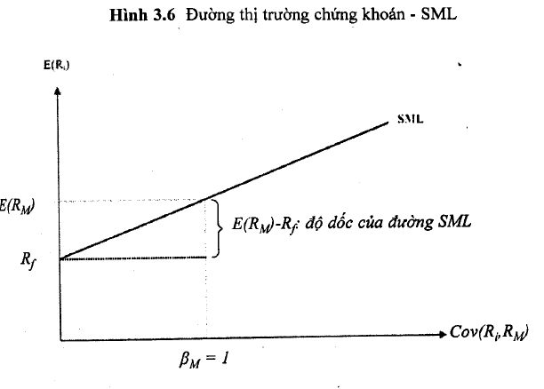 Đường thị trường chứng khoán (SML – Stock Market Line) là đưỉmg thẳng thể hiện mối quan hệ giữa rủi ro hệ thống và TSLT cùa bất kỳ tài sản nào. Phương trình của SML (xem Hình 3.6) dựa ừên các ước lượng ị TSLT của tài sản phi rủi ro và của danh mục thị trường, từ đỏ ta có thể tính toán TSLT của một tài sản khi biết rủi ro hệ thông của tài sản đó. ;