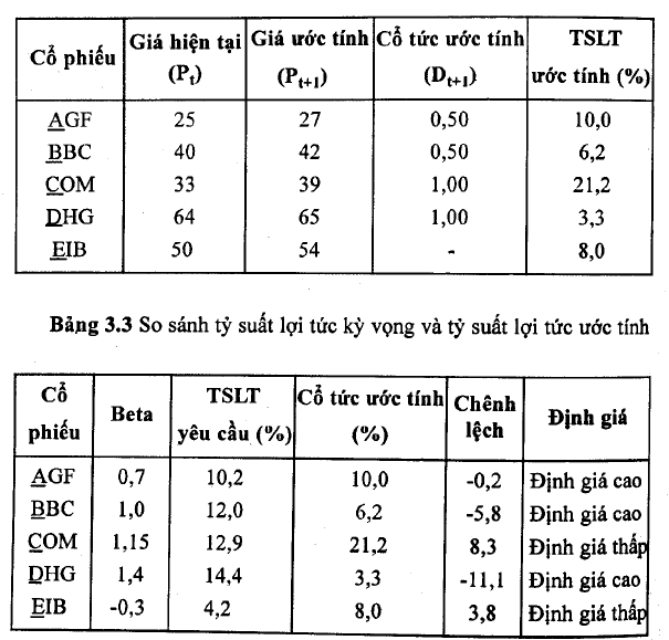 Bàng 3.3 tóm lược mối quan hệ giữa tỷ suất lợi tức yêu cầu của mỗi cổ phiếu dựa ưên rủi ro hệ thống của chủng như đã được tính toán ưước đây và tỷ suất lợi tức ước tính dựa trên giá cả hiện tại, tương lai và cổ tức tương lai của chúng. Sự chênh lệch giữa tỷ suất lợi tức ước tính và tỷ suất lợi tức yêu cầu được gọi là hệ sổ aỉpha của cổ phiếu. Alpha này có thể dương (cổ phiếu bị định giá thấp) và âm (cổ phiếu bị định giá cao). Nếu như alpha bằng 0, cổ phiếu này nằm trên đường SML, và được định giá đúng tương xứng với rủi ro hệ thống của nó.