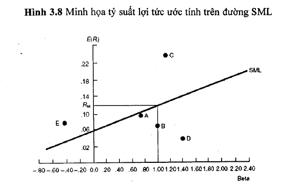 Hình 3.8 cho thấy cổ phiếu A gần như nằm chính xác trến đường SML, vl thế nó được xem như được định giá đúng do tỷ suất lợi tức ước tính của nó bàng với tỷ suất lợi tức yêu cầu. cổ phiếu B và D được xem là bị định giá cao vì tỷ suất lợi tức ước tính của nó cho khoảng thời gian tới thấp hơn cái mà nhà đầu tư đòi hỏi ứng với mức rủi ro hệ thống nhất định cùa chúng. Kết quả là, chúng nằm dưới đường SML. Ngược lại, các cổ phiếu c và E có một tỷ suất lợi tức ước lượng cao hơn tỳ suất lợi tức mà các nhà đầu tư yêu cầu. Vì vậy, cả hai cổ phiếu này đều nằm trên đường SML, cho thấy rằng chúng bị định giá thấp.