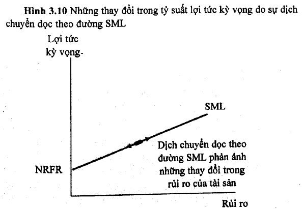 Di chuyển dọc theo đường SML: Các nhà đầu tư sẽ giữ những cơ hội đầu tư ở một nơi nào đó trên đường SML dựa trên những cảm nhận về rủi ro của cơ hội đầu tư. Rõ ràng, nểu rủi ro của một cơ hội đầu tư thay đổi do bởi sự thay đổi của một trong những nguồn rủi ro (rủi ro kinh doanh, v.v..), nó sẽ di chuyển dọc theo SML. Chẳng hạn, nểu một công ty đổi mặt với rủi ro tài chính tăng lên thông qua việc phát hành một lượng lớn trái phiếu (tăng đòn bẩy tài chính), cảc nhà đầu tư sẽ cảm nhận cổ phiếu thường của công ty là rủi ro hơn và cổ phiếu sỗ dịch chuyển dọc theo SML tới một vị trí có rủi ro cao hơn. Khi đó, các nhà đầu tư sẽ yêu cầu một tỷ suất lợi tức cao hơn. VI cổ phiểu thường trở nên rủi ro hơn, dẫn đến sự thay đổi vị trí của nó trên SML. Bẩt kỳ sự thay đổi nào trong giá trị tài sản ảnh hưởng đển các yếu tố rủi ro cơ bản hoặc rủi ro thị trường của nó (hệ số beta) sẽ làm cho tài sản dịch chuyển dọc theo đường SML (như được biểu diễn ở Hình 3.10). Chú ý rằng đuỉmg SML không thay đổi, chi vị trí của các tài sản trên đường SML thay đổi.