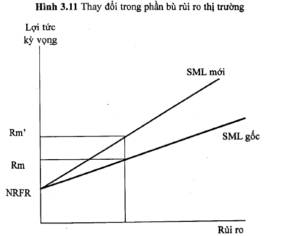 Sự thay đổi của phần bù rủi ro hàm ý một sự thay đổi trong độ dốc của SML (xem Hình 3.11). Hình này giả định một sự gia tăng trong phần bù rủi ro thị trường, nghĩa là một sự gia tăng độ dốc của đường SML (phần bù rủi ro). Sự thay đổi trong độ dốc của đường SML sẽ ảnh hưởng dén tỷ suất lợi tức kỳ vọng của tất cả các tài sản có rủi ro. Bất kể tại điểm nào trên đường SML gốc, tỷ suất lợi tức yêu cầu của khoản đầu tư sẽ tăng, mặc dù những đặc điểm rủi ro riêng lẻ của nó vẫn không thay đổi.