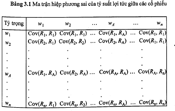Biểu thức (3.8) thể hiện rõ vai trò đặc trưng của phương sai và hiệp phương sai trong rủi ro cùa tài sản. Khi cỏ nhiều chửng khoán trong nền kinh tế, sẽ có nhiều hiệp phương sai hơn phương sai. Do vậy, hiệp phương sai của một chứng khoán riêng biệt với tất cả các chứng khoán còn lại sỉ : vượt trội hơn sự đóng góp của chứng khoán đó đển tổng rủi ro của danh mục. Nói cách khác, chúng ta có thể đo lường sự đóng góp của cổ phiếu A đến rủi ro của DMTT bởi hiệp phương sai của nó với danh mục đó: