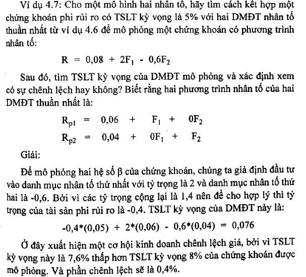 Ví dụ 4.7: Cho một mô hình hai nhân tố, hãy tìm cách két hợp một chứng khoán phi rủi ro có TSLT kỳ vọng là 5% với hai DMĐT nhân tố thuần nhất từ ví dụ 4.6 để mô phỏng một chứng khoán có phương trình nhân tố: