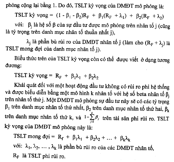 Một số lượng đủ lớn các chứng khoán sẽ làm cho các DMĐT hầu như không có rủi ro đặc thù. Ta có thể thiết lập các DMĐT mô phỏng các sự đầu tư mà không có rủi ro bằng cách xây dựng từ các DMĐT nhân tố thuần nhất với cùng các hệ số ß của sự đầu tư nào mà ta muốn mô phỏng. Phương trình nhân tố của DMĐT mô phỏng và của sự đầu tu được mô phỏng sẽ giống nhau ngoại trừ các (X. Theo giả định này thl không có các e trong các phương trinh nhân tổ này. Do đỏ, TSLT có thể có của DMĐT mô phỏng và sự đầu tư được mô phỏng chi chênh lệch nhau một hằng số, đó là chênh lệch của các TSLT kỳ vọng.