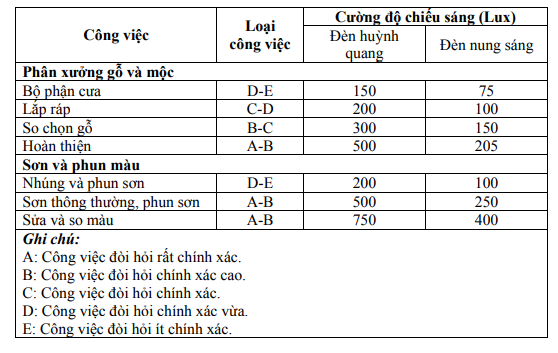 1. Yêu cầu về cường độ chiếu sáng như sau: