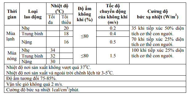 2. Yêu cầu về nhiệt độ, độ ẩm, tốc độ chuyển động của không khí, cường độ bức xạ nhiệt ở vị trí làm việc như sau: