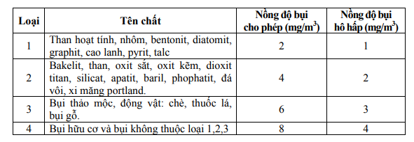 3. Giá trị nồng độ bụi tối đa cho phép không chứa Silic như sau: