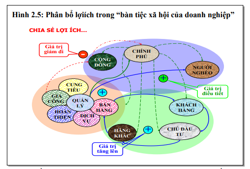 Bên cạnh 6 đối tượng hữu quan chủ yếu nêu trên, doanh nghiệp ngày nay cũng thường tiến hành những hoạt động chia sẻ hoặc làm lợi cho những đối tượng bất lợi thế trong xã hội cần được cưu mang. Mặc dù không phải là một đối tượng hữu quan chính thức, họ luôn là khách mời danh dự trong bàn tiệc xã hội của doanh nghiệp. Hình 1.6 mô tả mối quan hệ mắt xích giữa các đối tượng hữu quan, tình trạng phân phối giá trị giữa các đối trượng trong chuỗi và khả năng can thiệp của chính phủ.