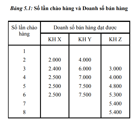 Xem bảng 5.1 ta thấy: Nỗ lực tốt nhất đối với khách hàng X: 4 lần chào hàng; Nỗ lực tốt nhất với khách hàng Y: 5 lần chào hàng; Nỗ lực tốt nhất với khách hàng Z: 7 lần chào hàng.