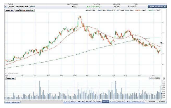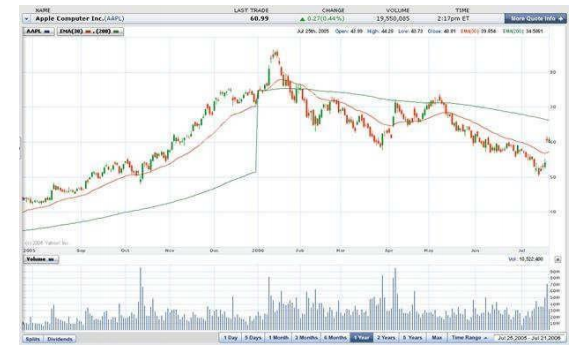 Quý vị có thể xem sự khác biệt do yếu tố gia quyền được thể hiện cho khung thời gian giống nhau cho thời gian 200 ngày cho biểu đồ cổ phiếu AAPL dưới đây. Chỉ đơn giản thay đường Trung bình Trượt Giản đơn SMA bằng Trung bình Trượt cấp Số nhân EMA, Đường Trung bình Trượt EMA 200 ngày này dịch chuyển thấp xuống phía dưới. Trong khi với SMA 200 ngày chạy ở phía trên.