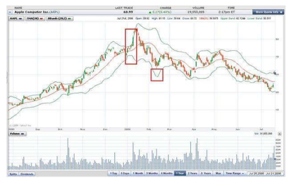 Rất nhiều nhà đầu tư sử dụng dải Bollinger để dự đoán mức độ biến động giá cổ phiếu và xác định khi nào đường trung bình trượt giản đơn SMA sẽ đổi chiều. Ví dụ, nếu quý vị phát hiện thấy hai đường biên dải Bollinger dịch chuyển ra xa nhau và bắt đầu di chuyển theo hai hướng đối lập và quý vị biết rằng giá cổ phiếu vừa biến động mạnh. Để xác định khi nào thì biến động giá cổ phiếu đó chấm dứt, quý vị có thể quan sát đến đường biên dải Bollinger mà đang dịch chuyển cùng hướng với giá chứng khoán. Khi dải này bắt đầu chuyển hướng và có xu hướng hội tụ với dải đối lập, tức là sự biến động của giá cổ phiếu hiện tại đang mất dần sức mạnh. Quý vị có thểm tham khảo tình huống của AAPL trong giữa tháng 2.