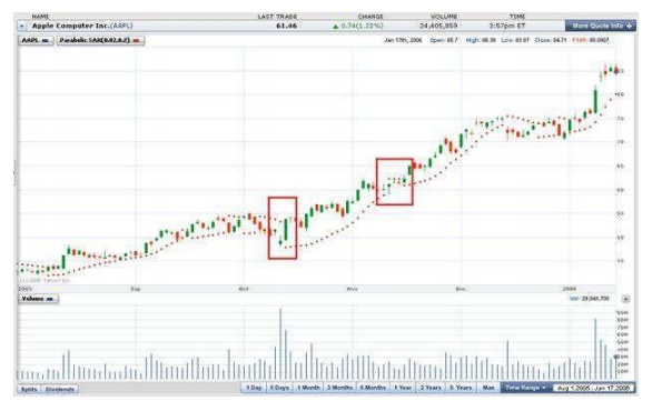 Khi quý vị dùng đường Parabollic SAR như một chỉ số cắt lỗ, quý vị sẽ không bao giờ giữ cổ phiếu đó khi quý vị biết rằng chỉ số này đang cho tín hiệu là bạn nên bán cổ phiếu. Tuy nhiên, chỉ số này cũng có hạn chế của nó đó là nó có thể làm quý vị bán cổ phiếu trong lúc nó chỉ là một tín hiệu tạm thời giảm giá trước khi tiếp tục tăng cao hơn trước như là trường hợp của cổ phiếu của AAPL diễn ra trong Tháng 11 như trong biểu đồ sau: