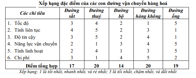 Bảng xếp hạng (bảng 3.1) thể hiện sự so sánh giữa các loại phương tiện vận chuyển hàng hoá theo 6 tiêu thức về tốc độ, tính liên tục, độ tin cậy, năng lực vận chuyển, tính linh hoạt và chi phí. Tuy nhiên bảng xếp hạng này hoàn toàn chỉ mang tính tương đối, việc lựa chọn loại đường vận chuyển /phương tiện nào còn phụ thuộc vào nhiều yếu tố cụ thể như đặc điểm mặt hàng, qui mô lô hàng, yêu cầu về địa điểm và thời gian giao hàng của khách hàng của từng lô hàng vận vận chuyển khác nhau