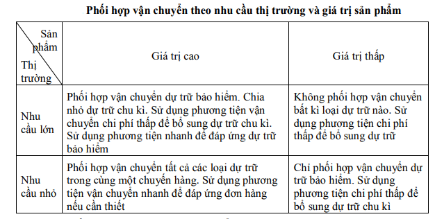 Các phương án phối hợp giữa vận chuyển và dự trữ hàng hoá cần được cân nhắc tuỳ thuộc vào qui mô nhu cầu thị trường và loại hình sản phẩm (xem bảng 3.4). Đối với những mặt hàng có giá trị cao và có nhu cầu đặt hàng lớn thì có thể chia nhỏ dự trữ chu kì để tiết kiệm chi phí vận chuyển bằng cách sử dụng các phương tiện vận chuyển chi phí thấp để bổ sung loại hình dự trữ này. Bên cạnh đó, có thể phối hợp vận chuyển dự trữ bảo hiểm của nhiều mặt hàng thuộc nhóm này để giảm chi phí dự trữ, đồng thời sử dụng phương tiện vận chuyển nhanh để đáp ứng đòi hỏi của khách hàng. Còn với những mặt hàng giá trị cao mà nhu cầu thị trường thấp thì nên phối hợp vận chuyển tất cả các lô hàng để giảm chi phí dữ trữ hàng hoá.