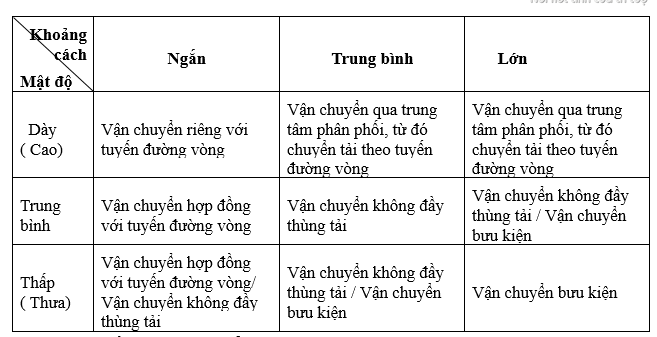 Doanh nghiệp cần cân nhắc đến mật độ khách hàng và khoảng cách từ doanh nghiệp/trung tâm phân phối tới địa điểm giao hàng khi thiết kế mạng lưới vận chuyển để từ đó có các phương án phối hợp khác nhau trên từng khu vực (xem bảng 3.3).