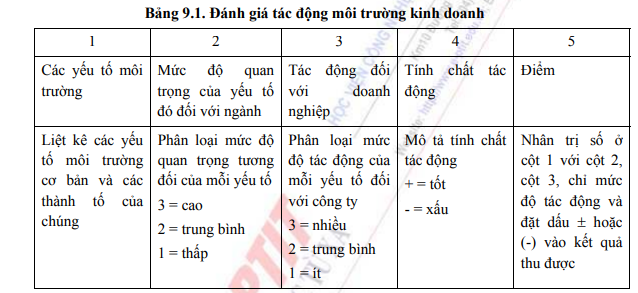 Bảng tổng hợp môi trường kinh doanh tổng hợp các yếu tố, môi trường chính yếu trong đó liệt kê từng yếu tố và đánh giá ảnh hưởng tốt hay xấu và ý nghĩa của yếu tố đó đối với việc soạn thảo chiến lược kinh doanh của doanh nghiệp.