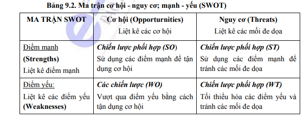 - Kết hợp các điểm mạnh bên trong với mối nguy cơ bên ngoài và ghi kết quả của chiến lược WT