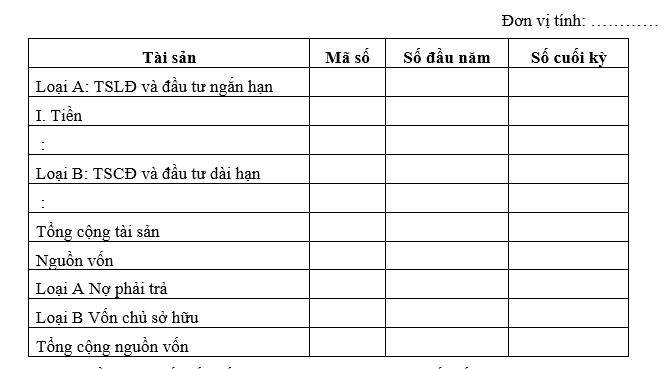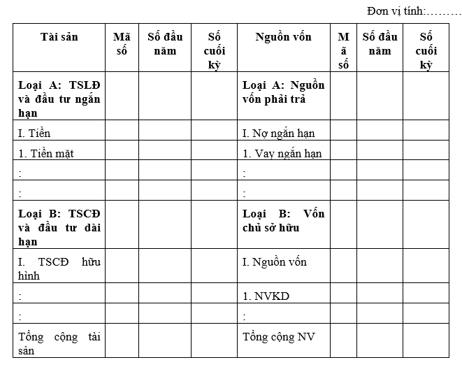 - Các chỉ tiêu bên tài sản được sắp xếp theo tính chất lưu động giảm dần của tài sản.